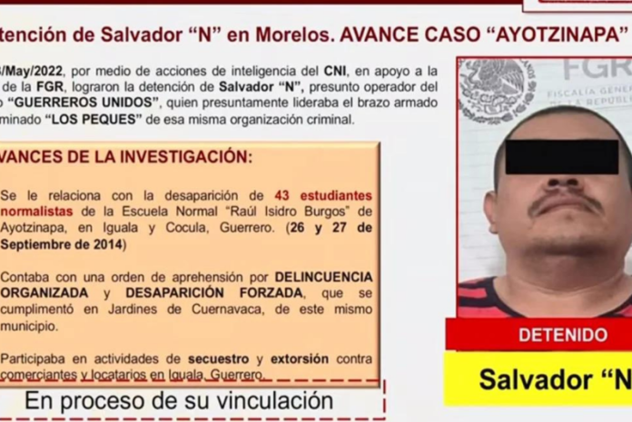Ricardo Mejía Berdeja, subsecretario de Seguridad Pública (SSPC), informó que se detuvo a Salvador “N”, presunto operador del grupo “Guerreros Unidos” y a quien se le relaciona con el caso de la desaparición de los 43 estudiantes normalistas de Ayotzinapa, Guerrero, ocurrido en septiembre de 2014.