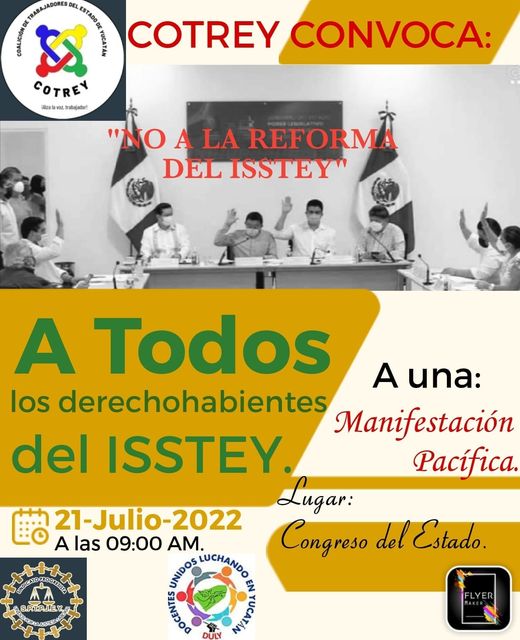 Los directivos y miembros del Cotrey convocan a los derechohabientes del Isstey para participar en la lucha que está en contra de la nueva Ley del Isstey,