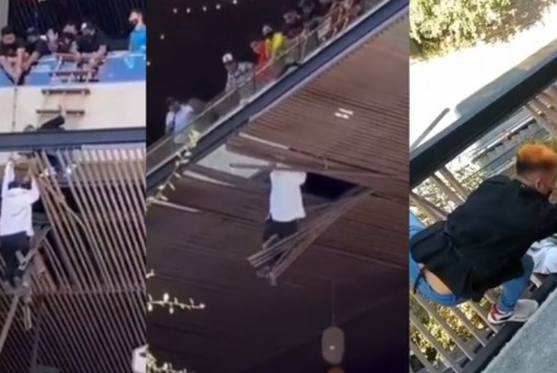 Personal de seguridad de la plaza relató que la persona realizaba destrozos, y al intentar detenerlo brincó un barandal de vidrio. Posteriormente cayó en una pérgola de plástico, la cual se venció por el peso, provocando que se desplomara hasta la planta baja.