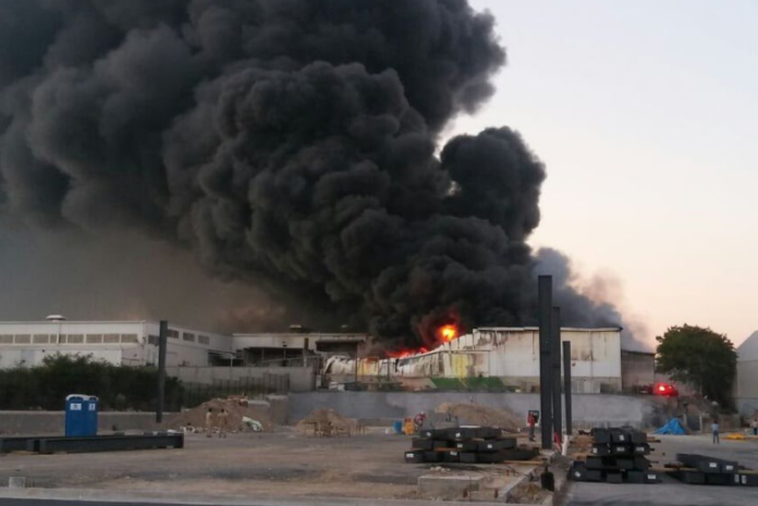 Un fuerte incendio se registra en un negocio de tarimas en el Parque Industrial El Milagro en el municipio de Apodaca.